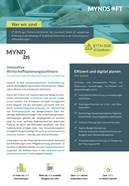 Sehr benutzerfreundlich konzentriert sich mynd.bs auf die Budgetierung und das Controlling unserer Einrichtung. So konnten wir unsere Wirtschaftsplanung effizient vornehmen und bereits nach kürzester Zeit erfolgreich abschließen.