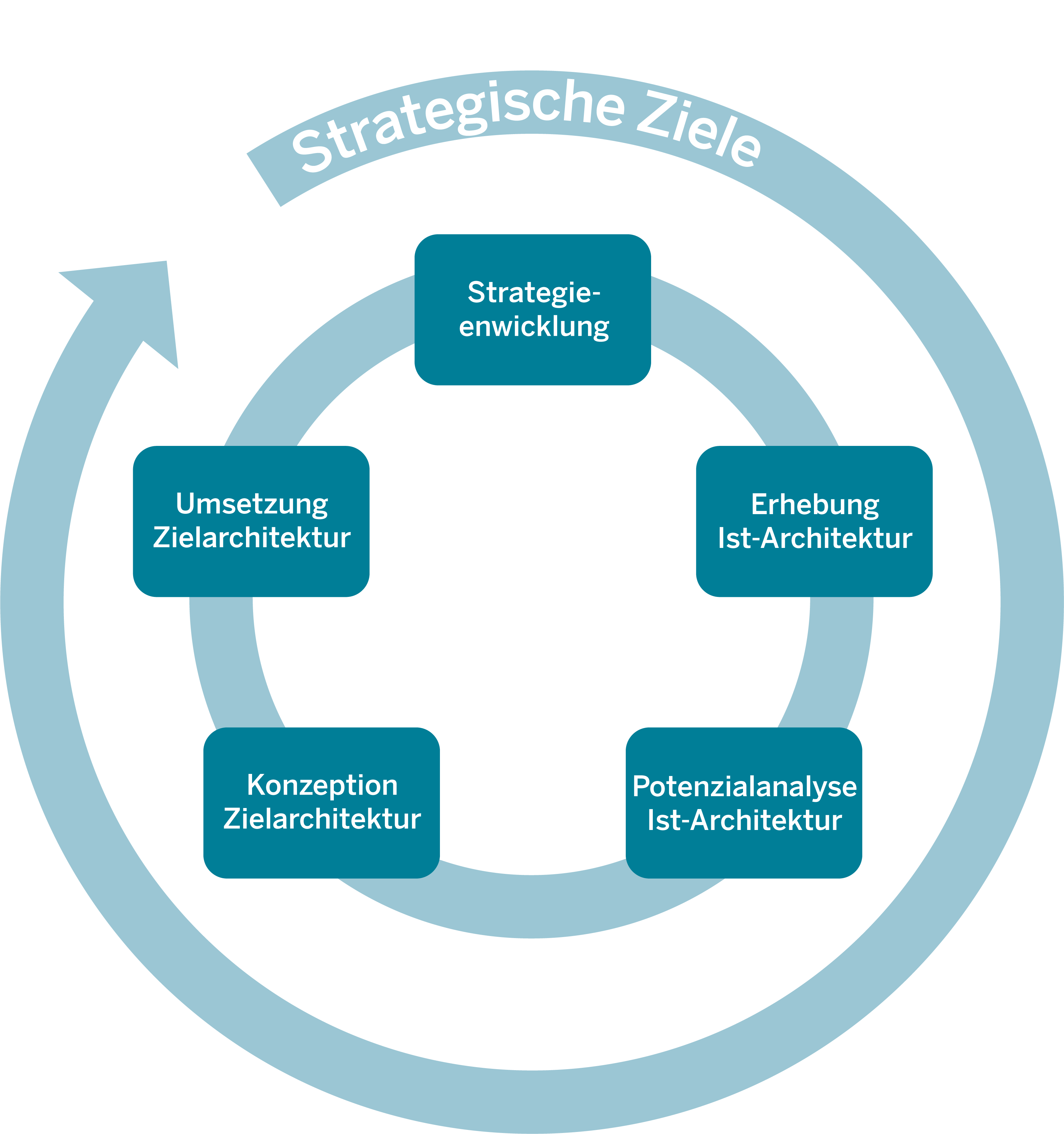 Dabei werden Zielbilder, Prinzipien und Maßnahmen konkretisiert, von der Prozess- und IT-Architektur bis zur organisatorischen Umsetzung.